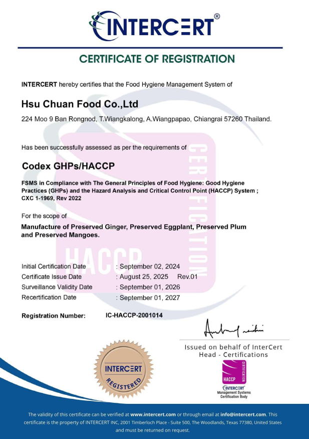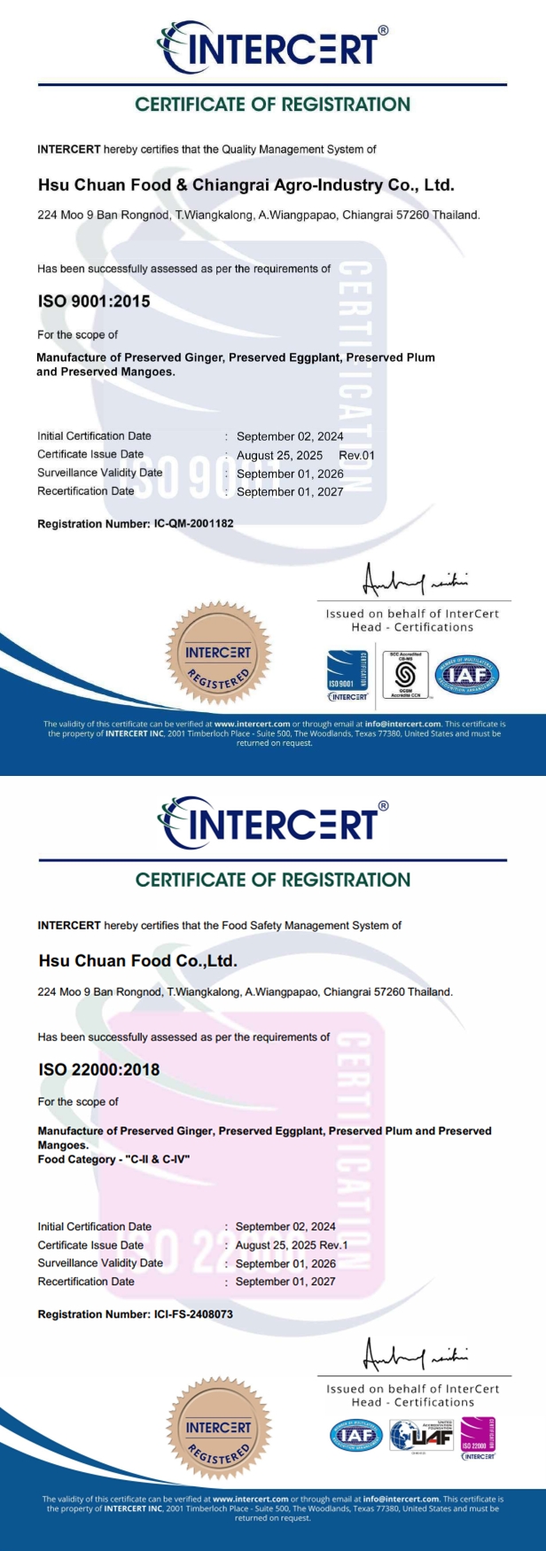 With experience and expertise in preserved ginger production and constant development of personnel and technology has brought us to meet the standard of GHPs , HACCP , ISO9001 , ISO22000 , FSSC22000 , KOSHER and HALAL